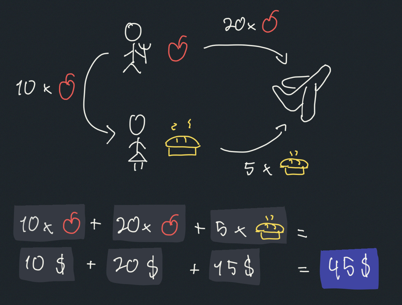 In Auroria there are 5 people. Three are apple farmers and two make apple pies. The apple pie makers buy from the apple farmers. Both the farmers and pie makers export their produce. One apple costs 1$, one apple pie 3$.